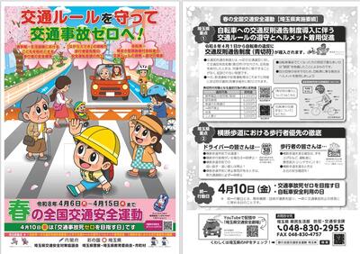 令和8年4月6日(月)~4月15日(水)は、春の全国交通安全運動の実施期間です。この時期、小学校に入学し、行動範囲の広がる小学校一年生の交通事故が増加します。特に4月10日は「交通事故死ゼロを目指す日」になっています。また、令和8年4月1日からは、 自転車の違反に交通反則通告制度(青切符)が導入さ れています。ゆとり運転・思いやり運転を広めて、子供たちの安心・安全を守っていくことができればと思います。